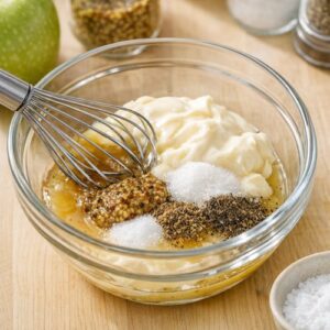 In a small mixing bowl, combine your mayonnaise, apple cider vinegar, granulated sugar, whole grain mustard, salt, celery seed, and black pepper. Whisk everything together until you’ve created a smooth, homogeneous dressing. You should see no streaks of mayo or vinegar—everything should be completely combined and uniform in color, which typically takes about one minute of whisking. The dressing should smell bright and tangy, with a subtle mustardy undertone.