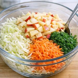 In a large mixing bowl, combine your shredded cabbage, lemon-juice-treated apples, shredded carrots, and fresh dill if you’re using it. Using a sturdy spoon or wooden spatula, toss the vegetables together gently but thoroughly. You want everything evenly distributed, but you’re not trying to bruise the cabbage.