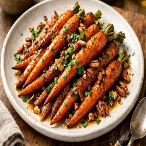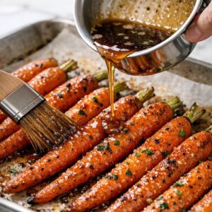 Remove the baking sheet from the oven and let it rest for 2-3 minutes. This brief rest allows the glaze to set slightly and the carrots to finish cooking from residual heat. Transfer to a serving platter while still warm—the visual presentation of glossy, mahogany-colored carrots is part of the joy of this dish. Spoon any remaining glaze from the baking sheet over the top. Serve immediately while they’re still warm and the texture is at its most tender.