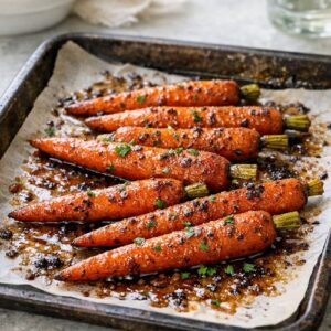 Absolutely. Use full-size carrots, trimmed and halved lengthwise (or quartered if very thick) so pieces are roughly 3-4 inches long. Arrange them cut-side down on the baking sheet. Full-size carrots may take 22-25 minutes instead of 20 because they’re denser, so check for fork tenderness at the 20-minute mark and add a few more minutes if needed. The flavor is identical; baby carrots are simply chosen for their uniform cooking time and elegant presentation.